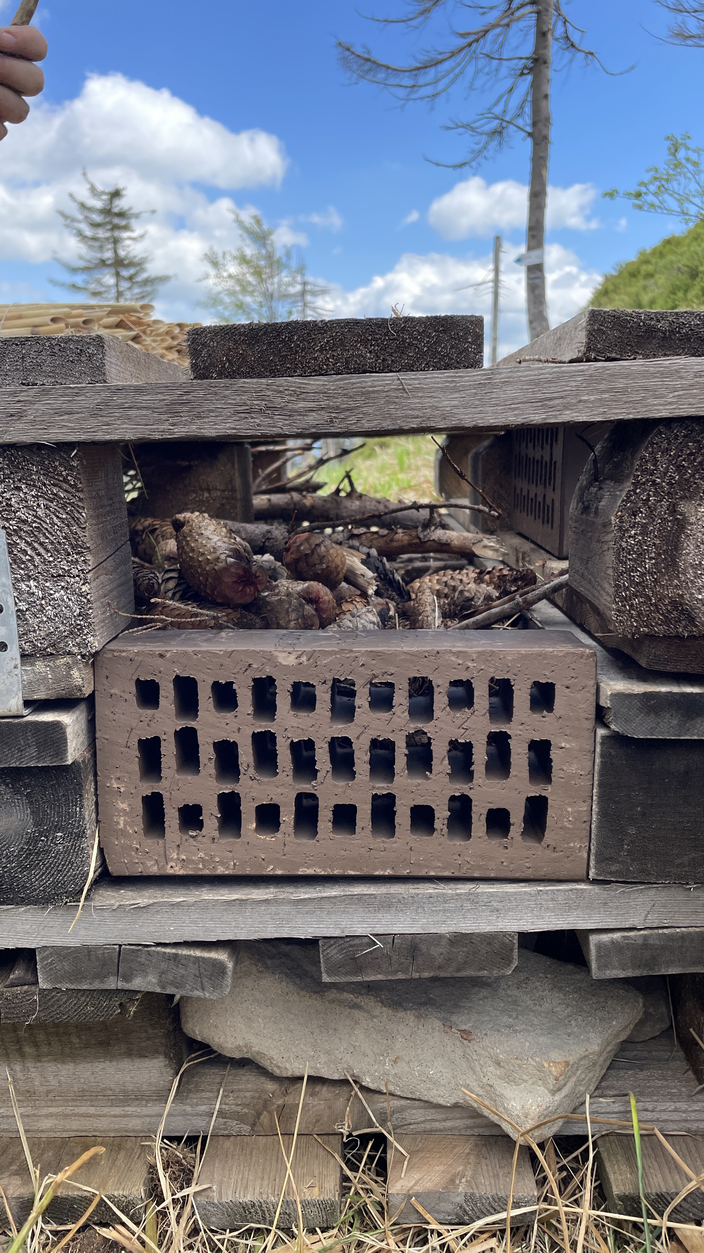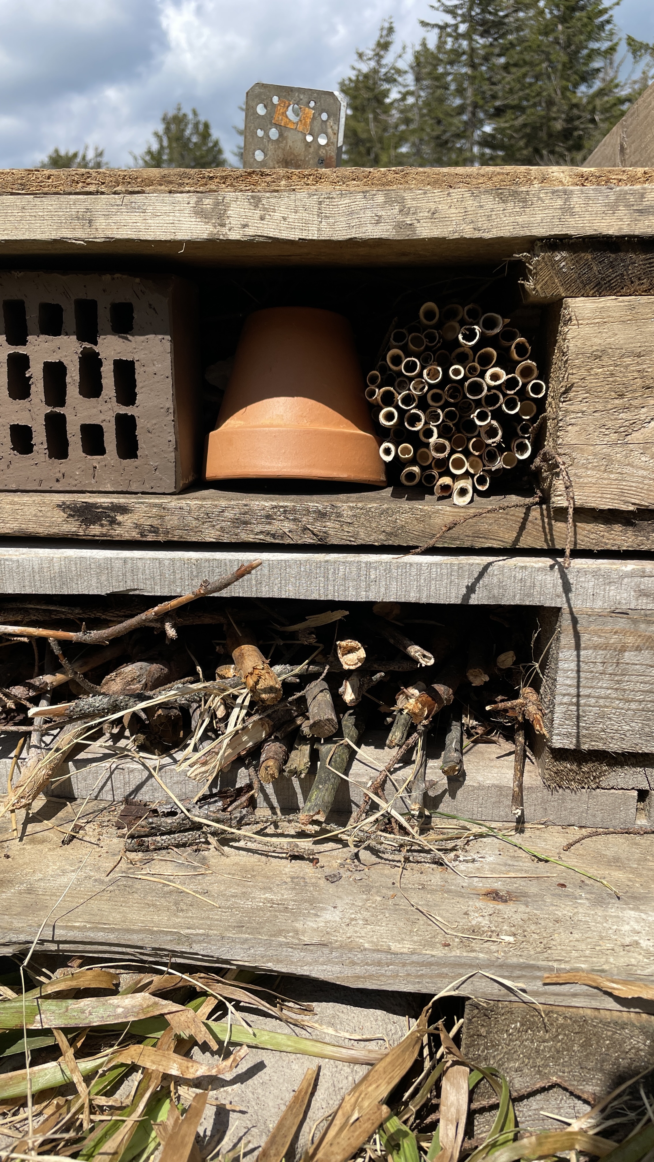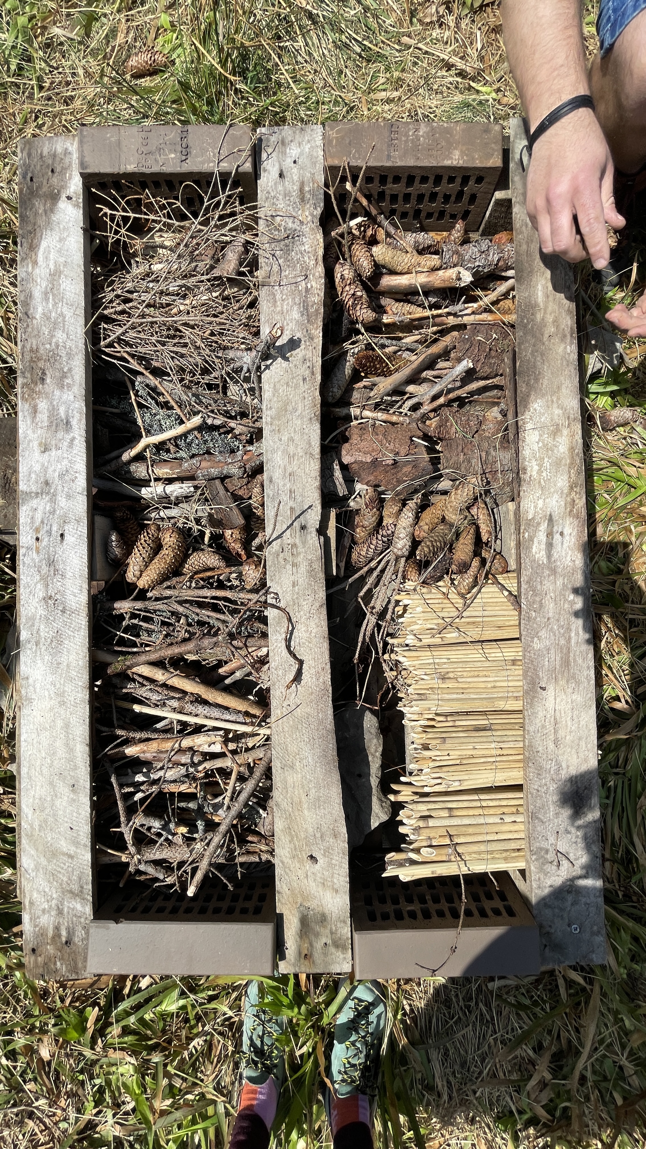 Hotel dla dzikich zapylaczy, który postanowiliśmy zbudować, został w całości zaprojektowany przez Michała. Zależało nam na działaniu w duchu zero waste, więc do budowy hotelu użyliśmy głównie materiałów, które udało się znaleźć wokół schroniska – były to różnego rodzaju palety, deski, gałęzie, szyszki itp.