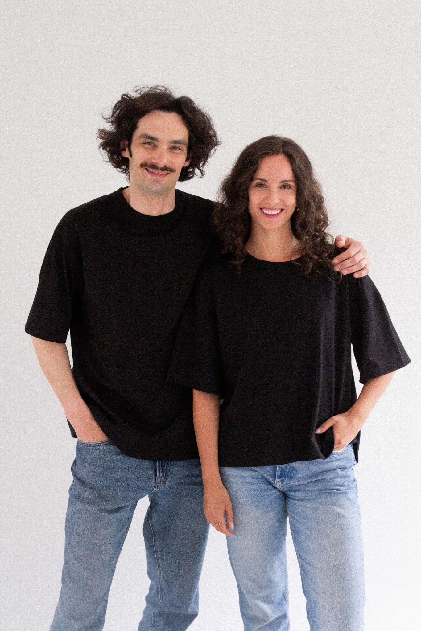 .MAKAK. is a black boxy T-shirt with short sleeves, round neckline, lowered shoulder line and wide sleeves. This slightly oversized wool T-shirt will complement your closet perfectly. In short, it's a T-shirt that will never go out of style and will always and everywhere fit in with the climate. Its length is suitable for any type of pants and skirts. It will go perfectly with .KIWI shorts. The T-shirt is sewn from fine wool knit fabric, which is pleasant to the touch, does not bite and provides maximum wearing comfort.
