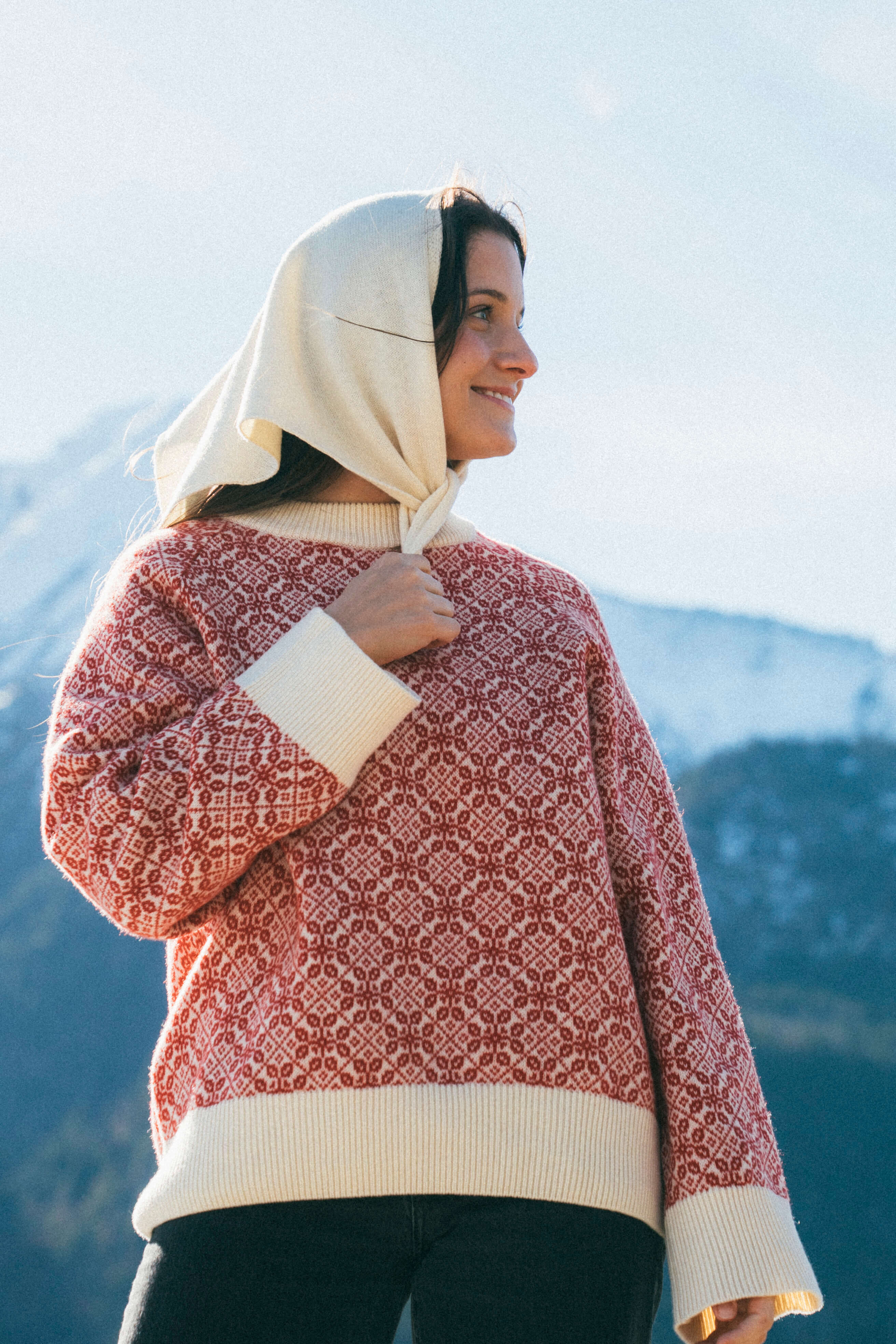 BARIBAL BESKID RWS – cream & red oversized merino wool sweater inspired by Beskid embroidery – 100% RWS-certified merino wool