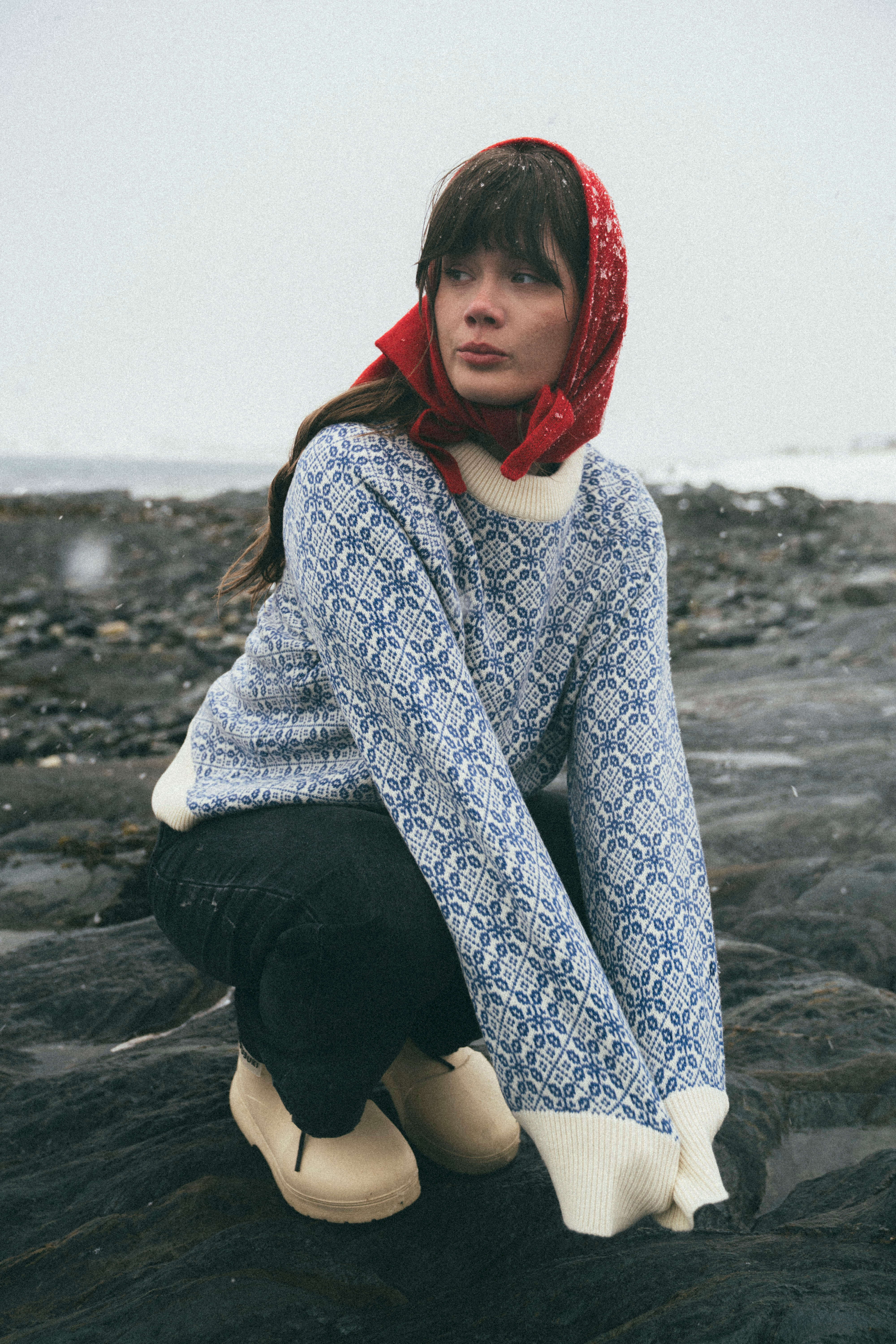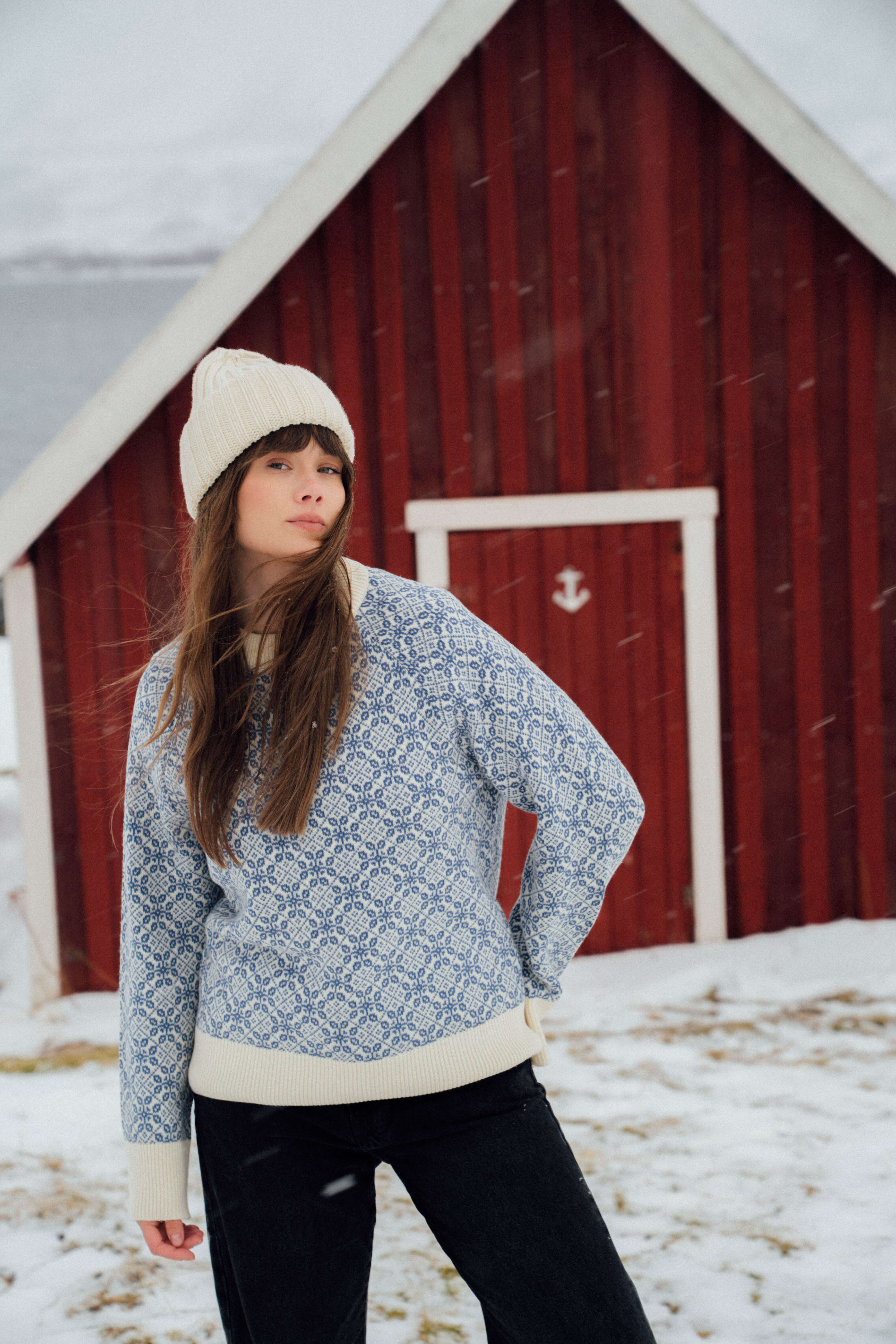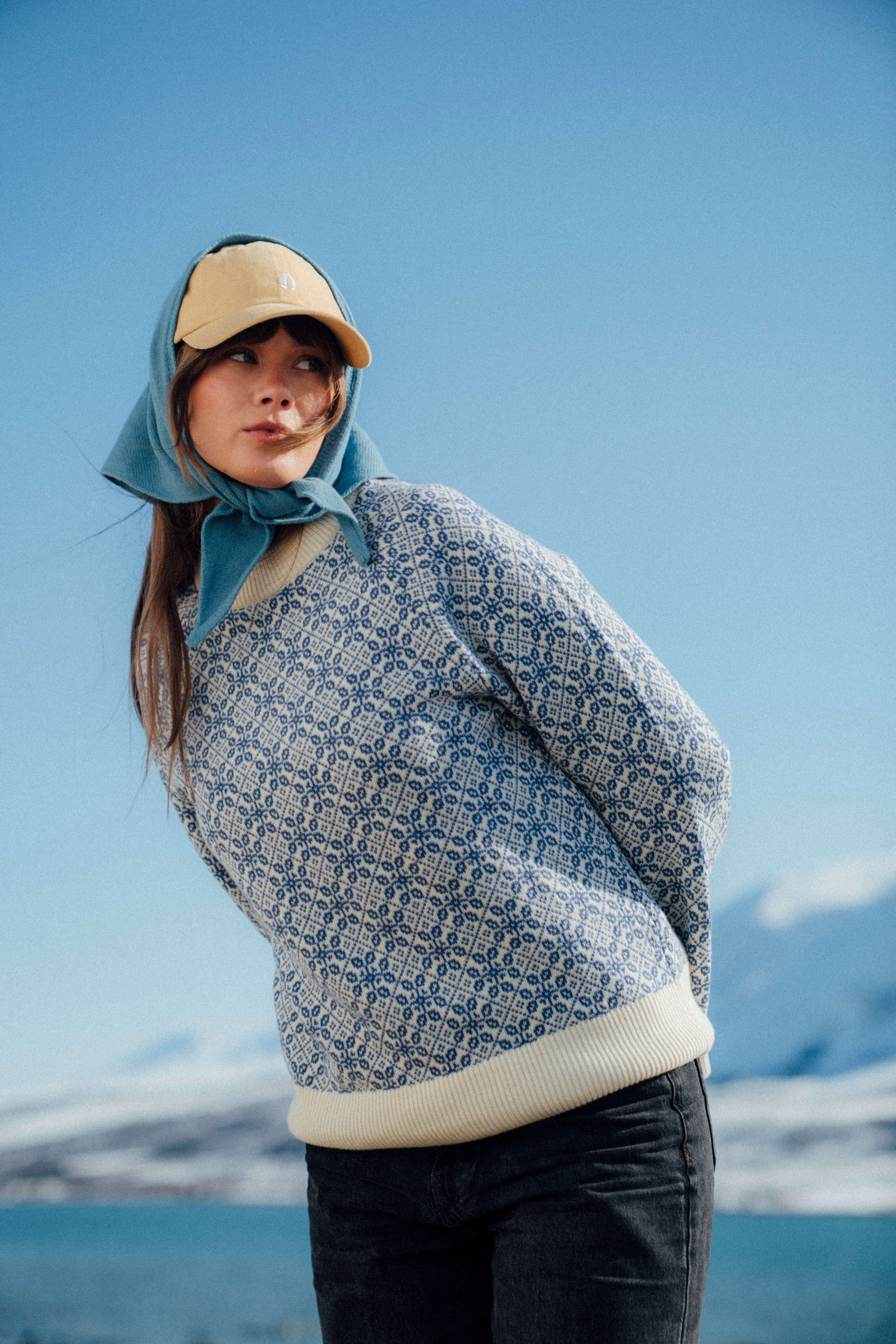 BARIBAL BESKID RWS – cream & cornflower blue oversized merino wool sweater inspired by Beskid embroidery – 100% RWS-certified merino wool