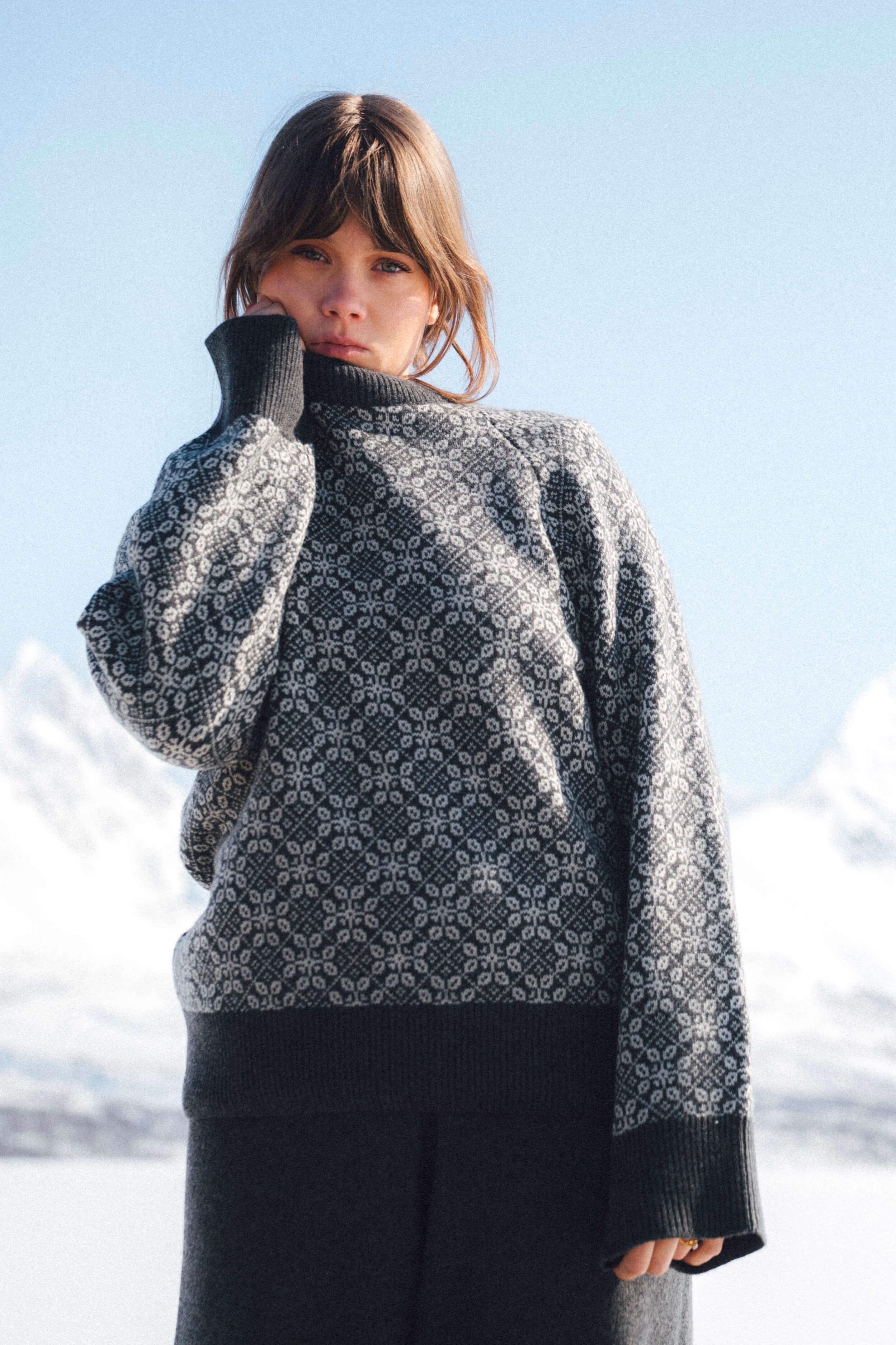 BARIBAL BESKID RWS – melange gray & cream oversized merino wool sweater inspired by Beskid embroidery – 100% RWS-certified merino wool