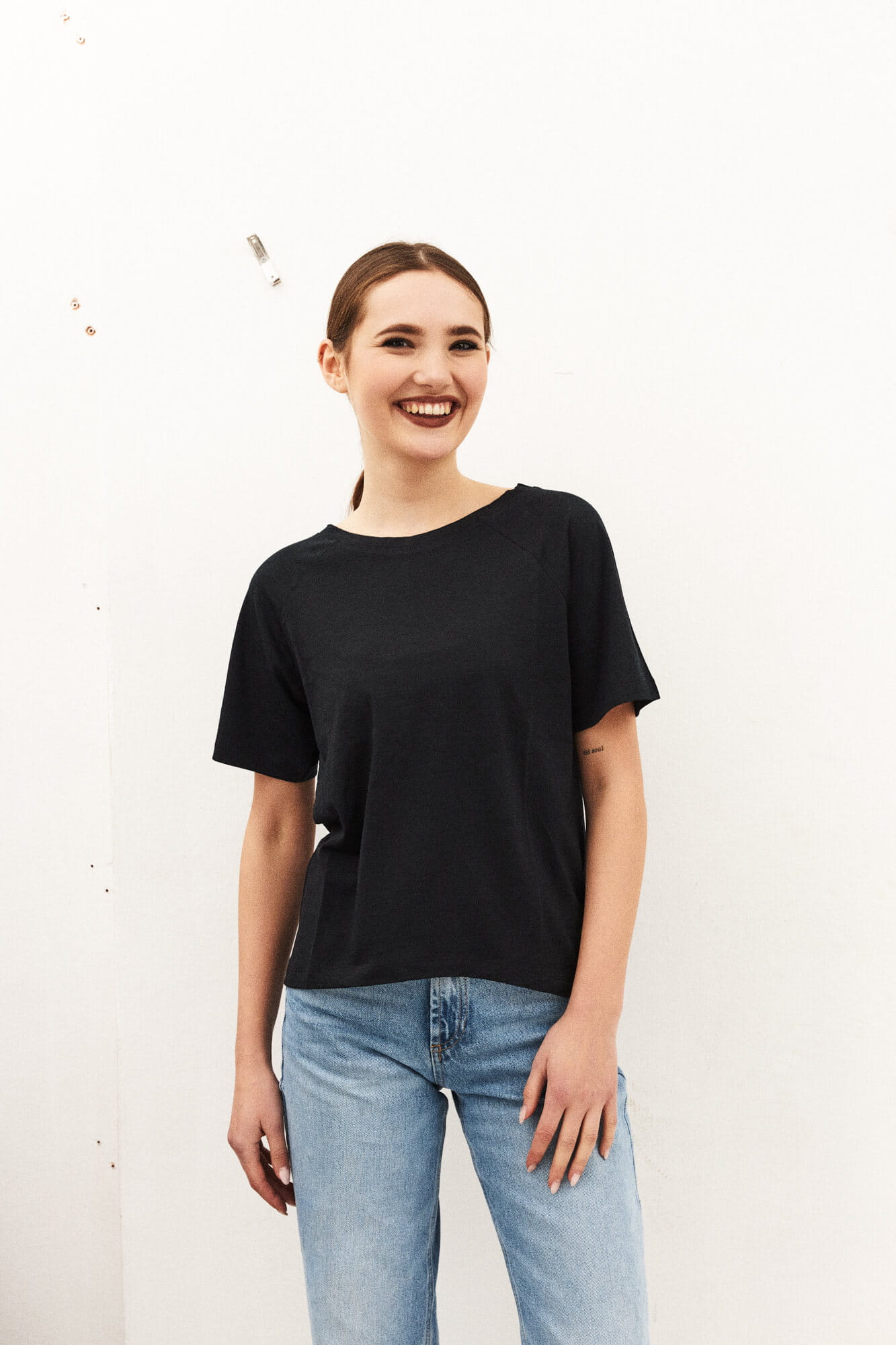 A black merino wool T-shirt that will never go out of style and will quickly become your go-to wardrobe essential. This classic cut tee features a round neckline and raglan sleeves. It drapes beautifully on all body types (one size fits women wearing S to L).