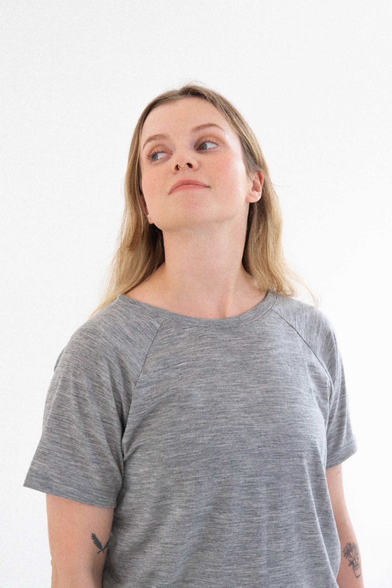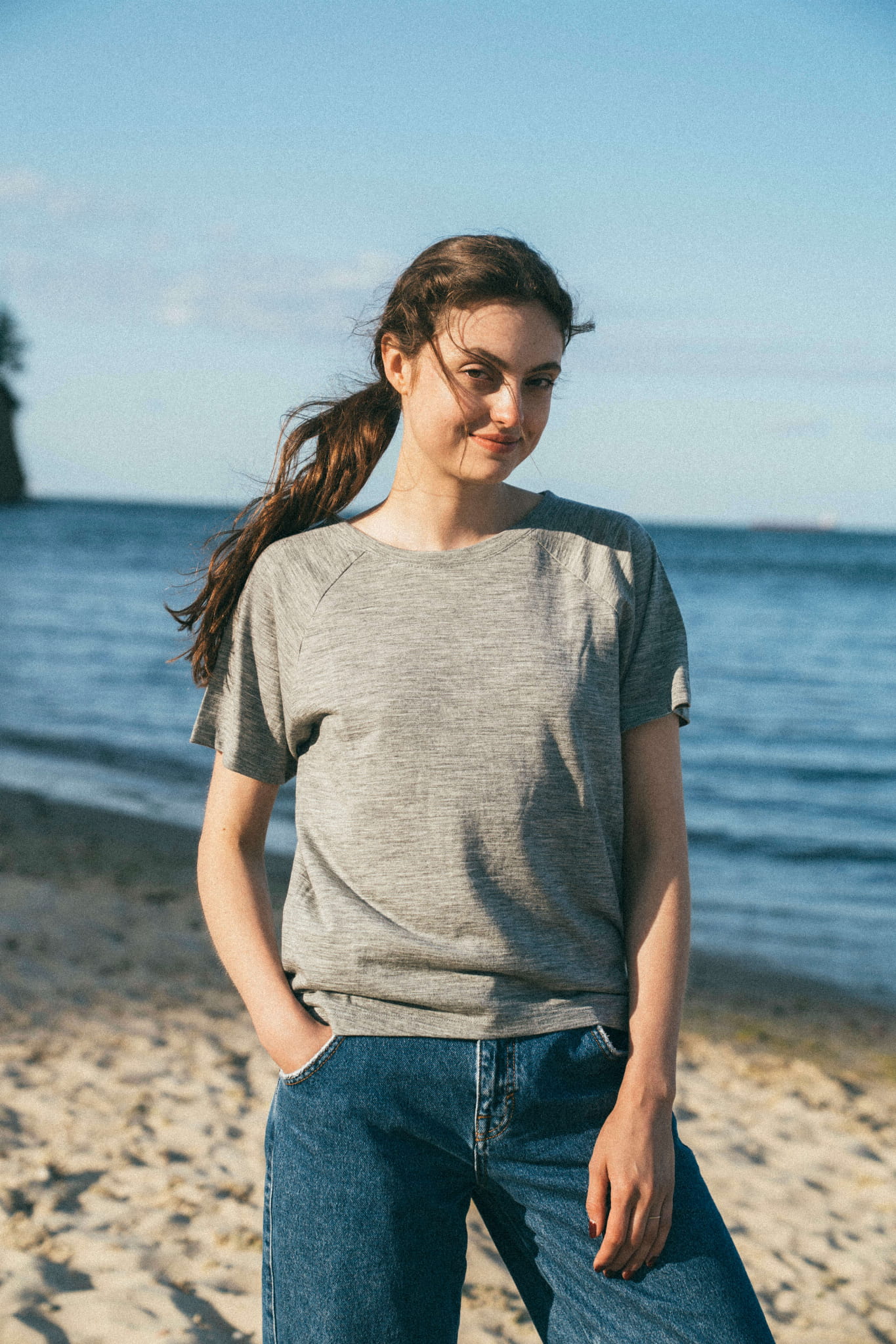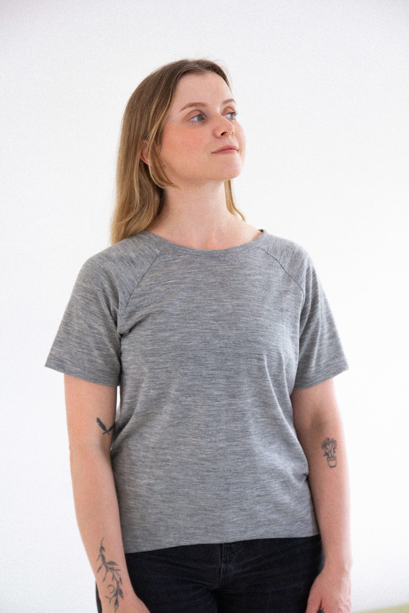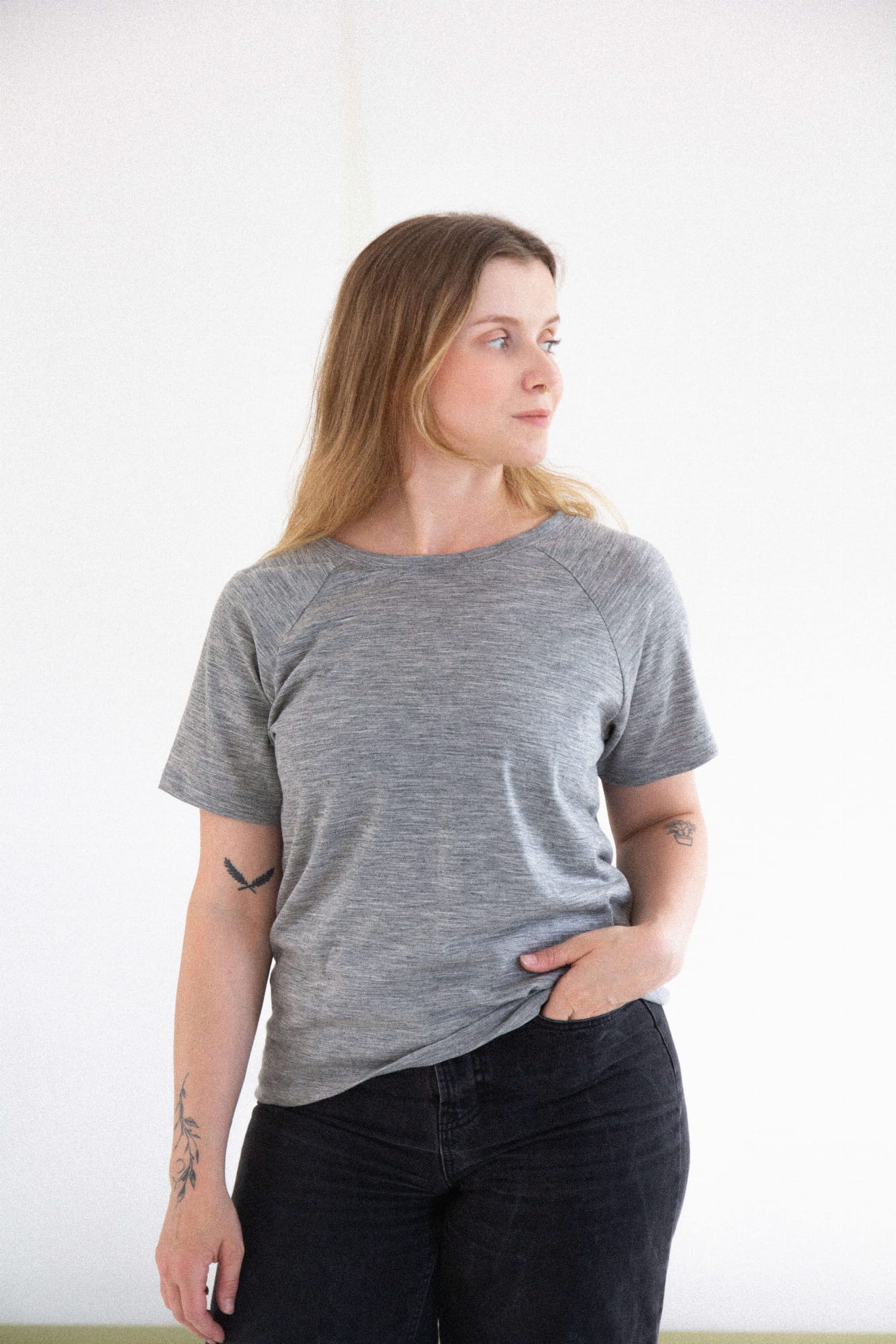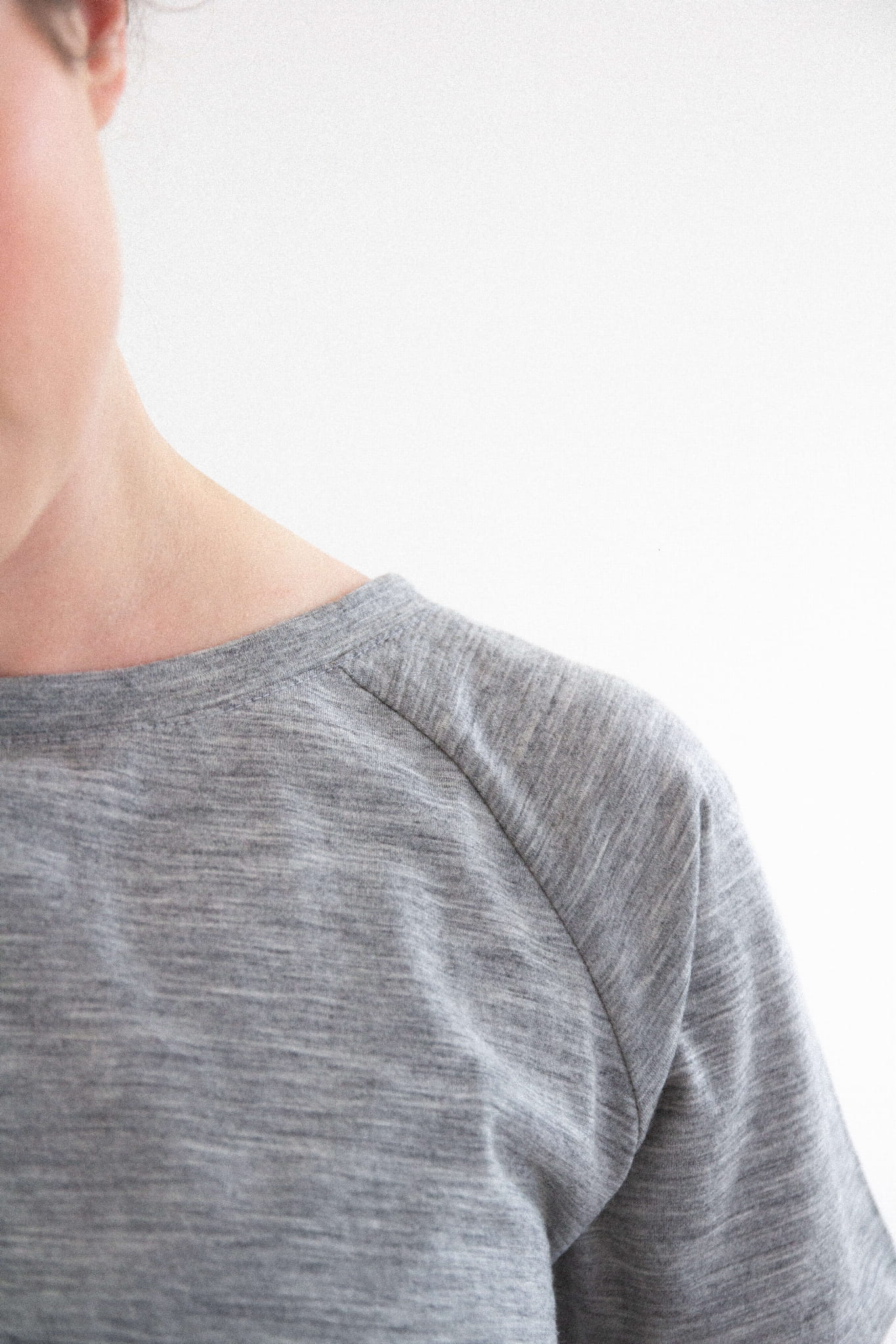 A gray merino wool T-shirt that will never go out of style and will quickly become your go-to wardrobe essential. This classic cut tee features a round neckline and raglan sleeves. It drapes beautifully on all body types (one size fits women wearing S to L).