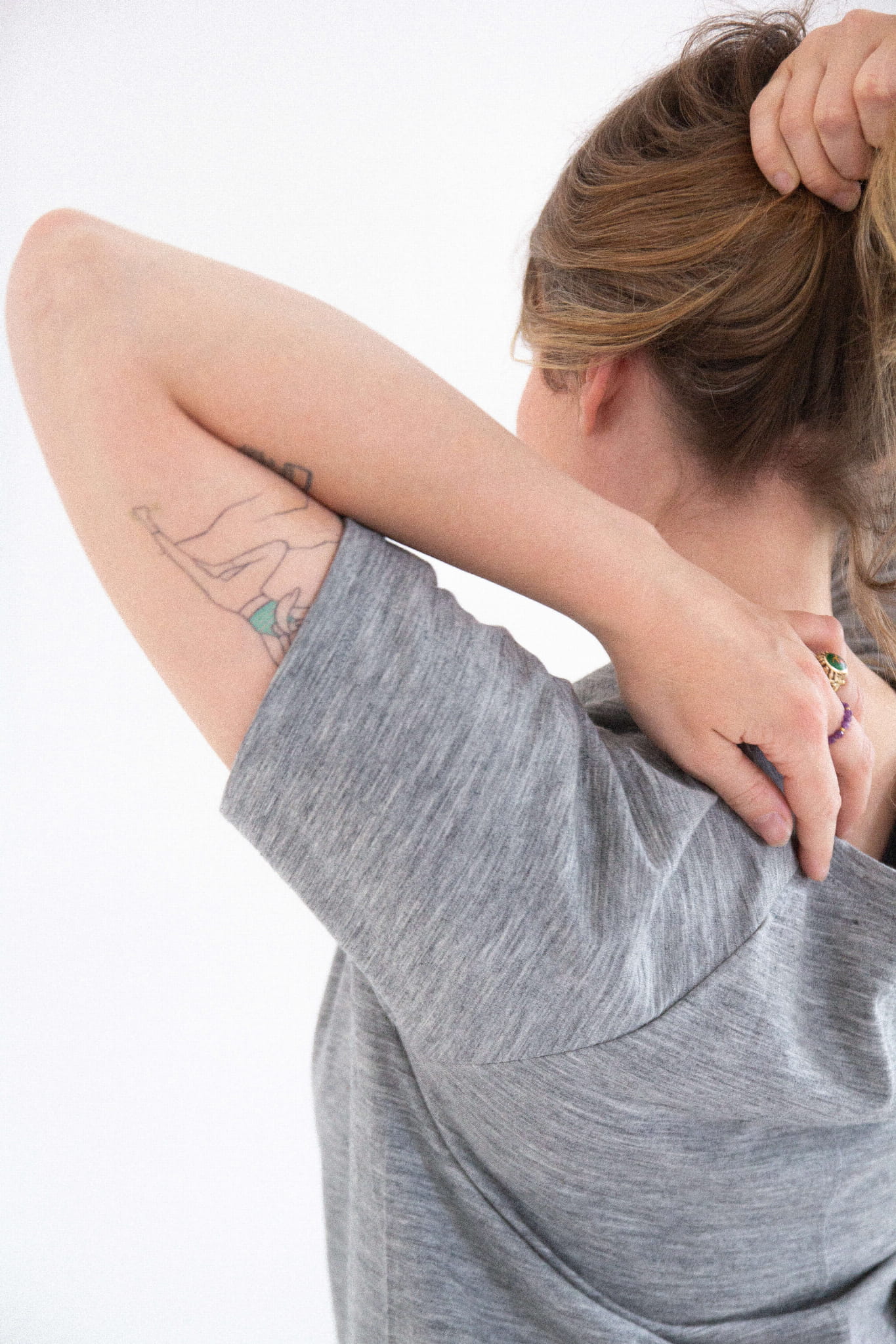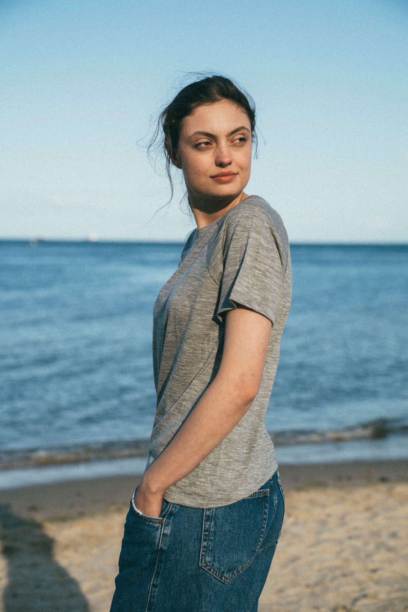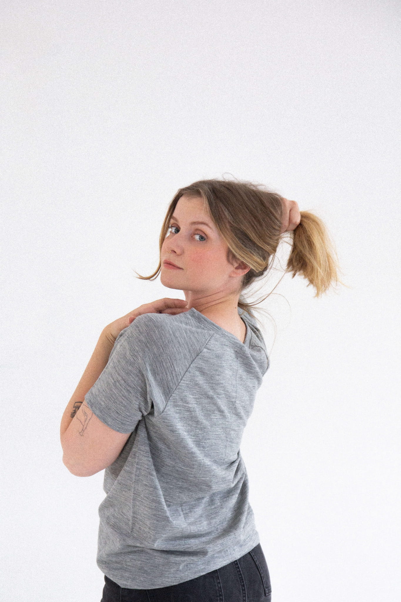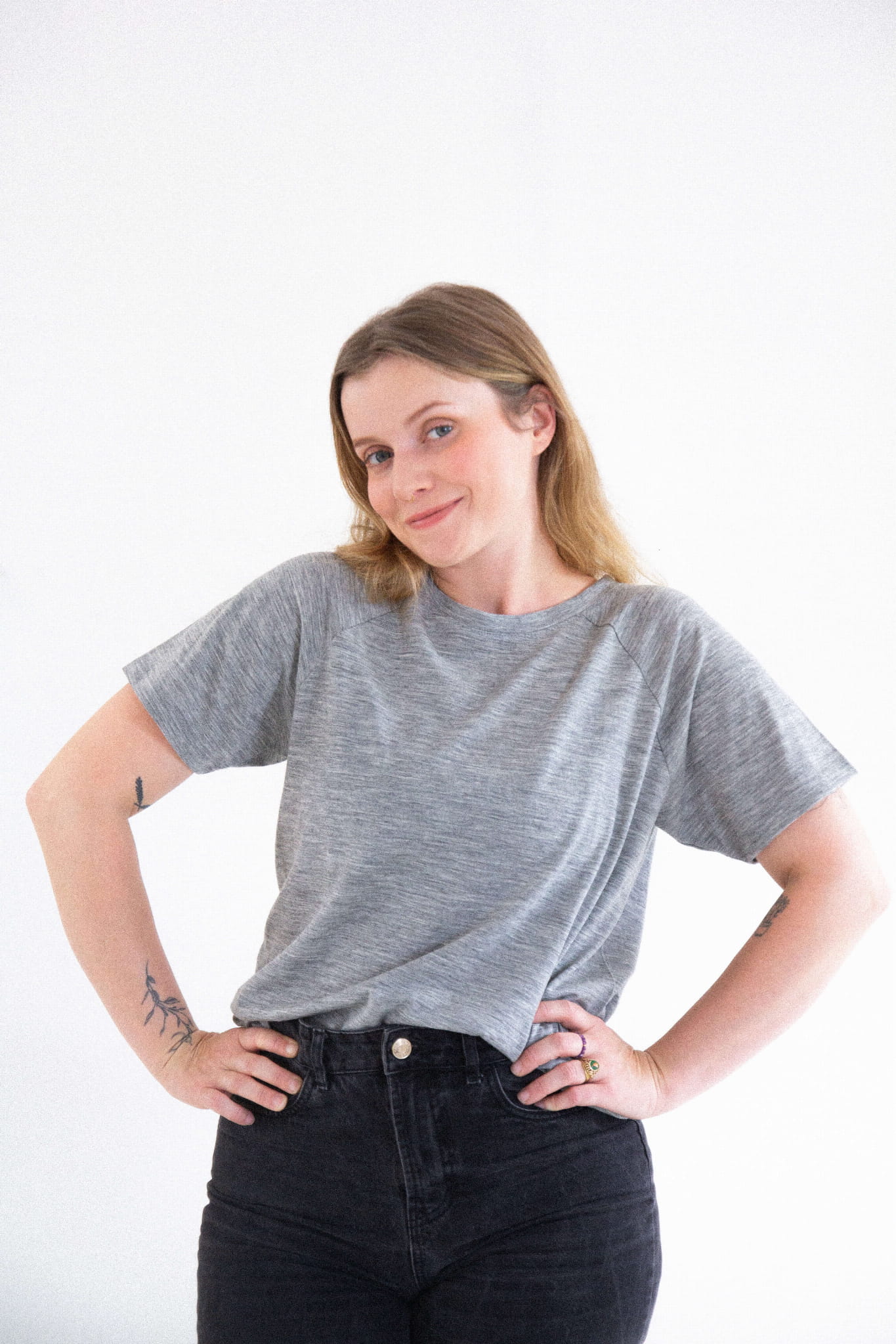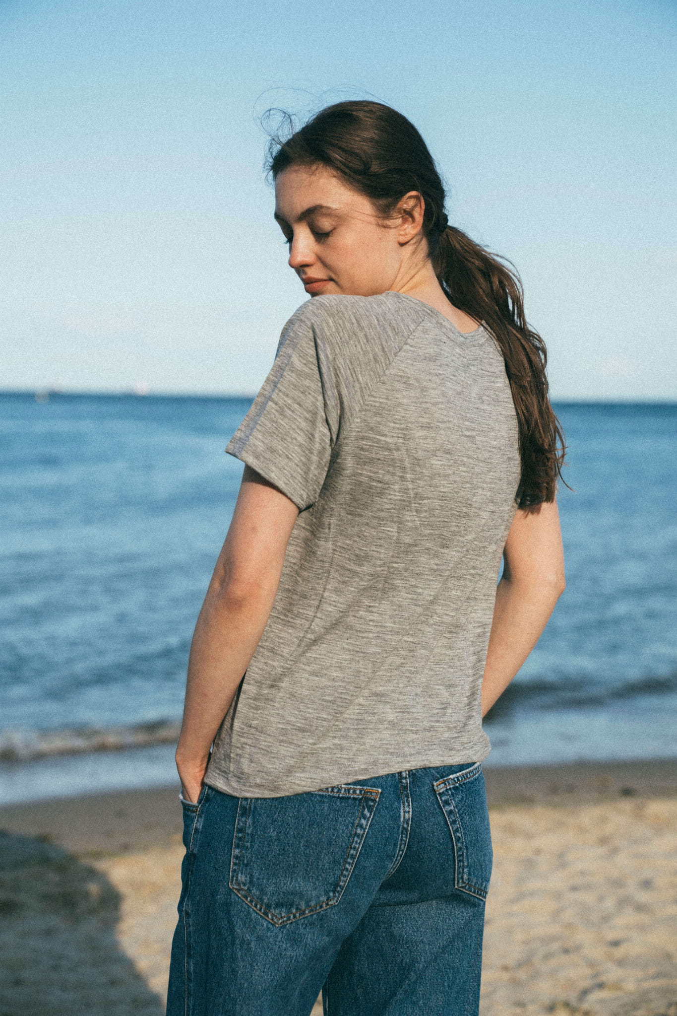 A gray merino wool T-shirt that will never go out of style and will quickly become your go-to wardrobe essential. This classic cut tee features a round neckline and raglan sleeves. It drapes beautifully on all body types (one size fits women wearing S to L).