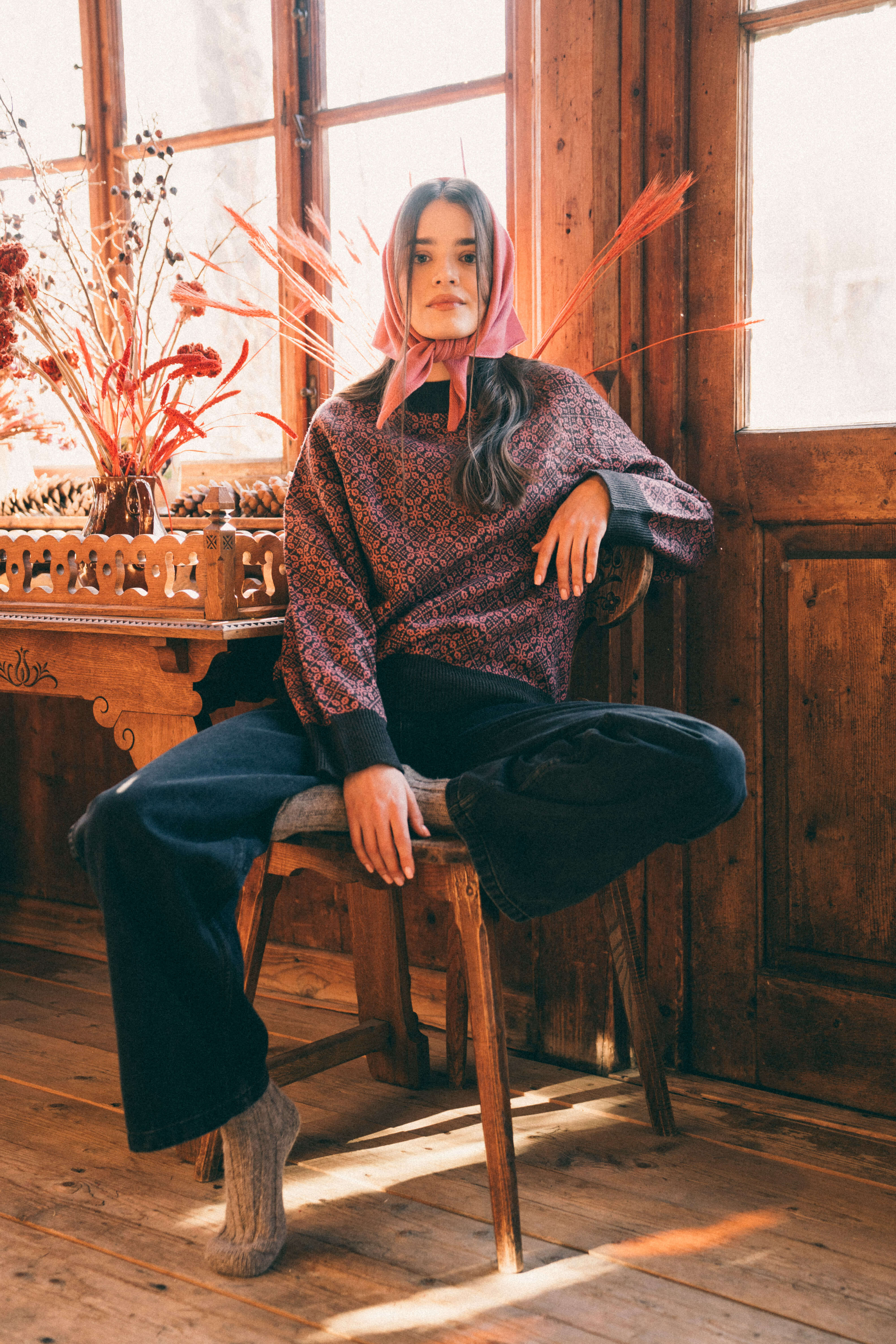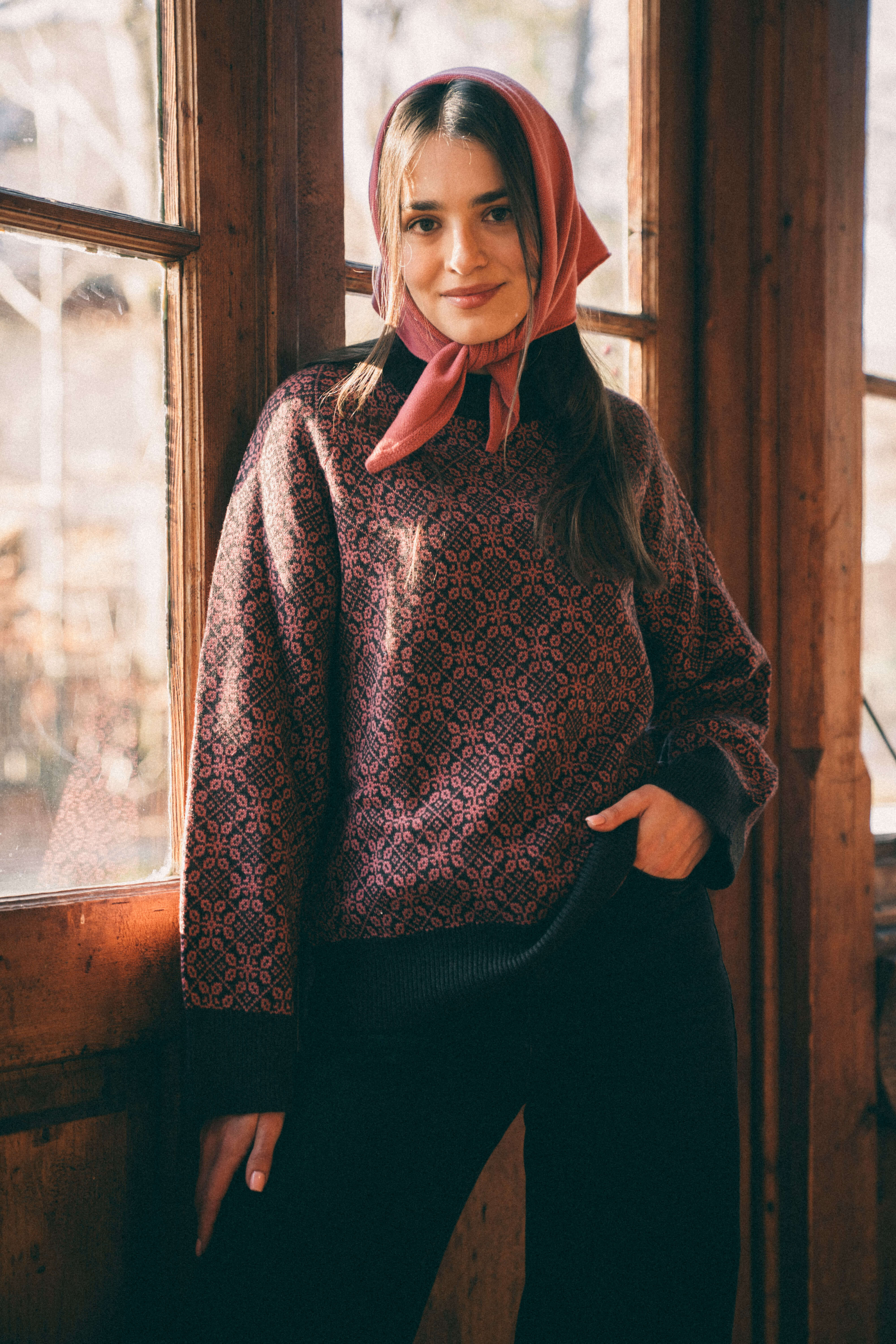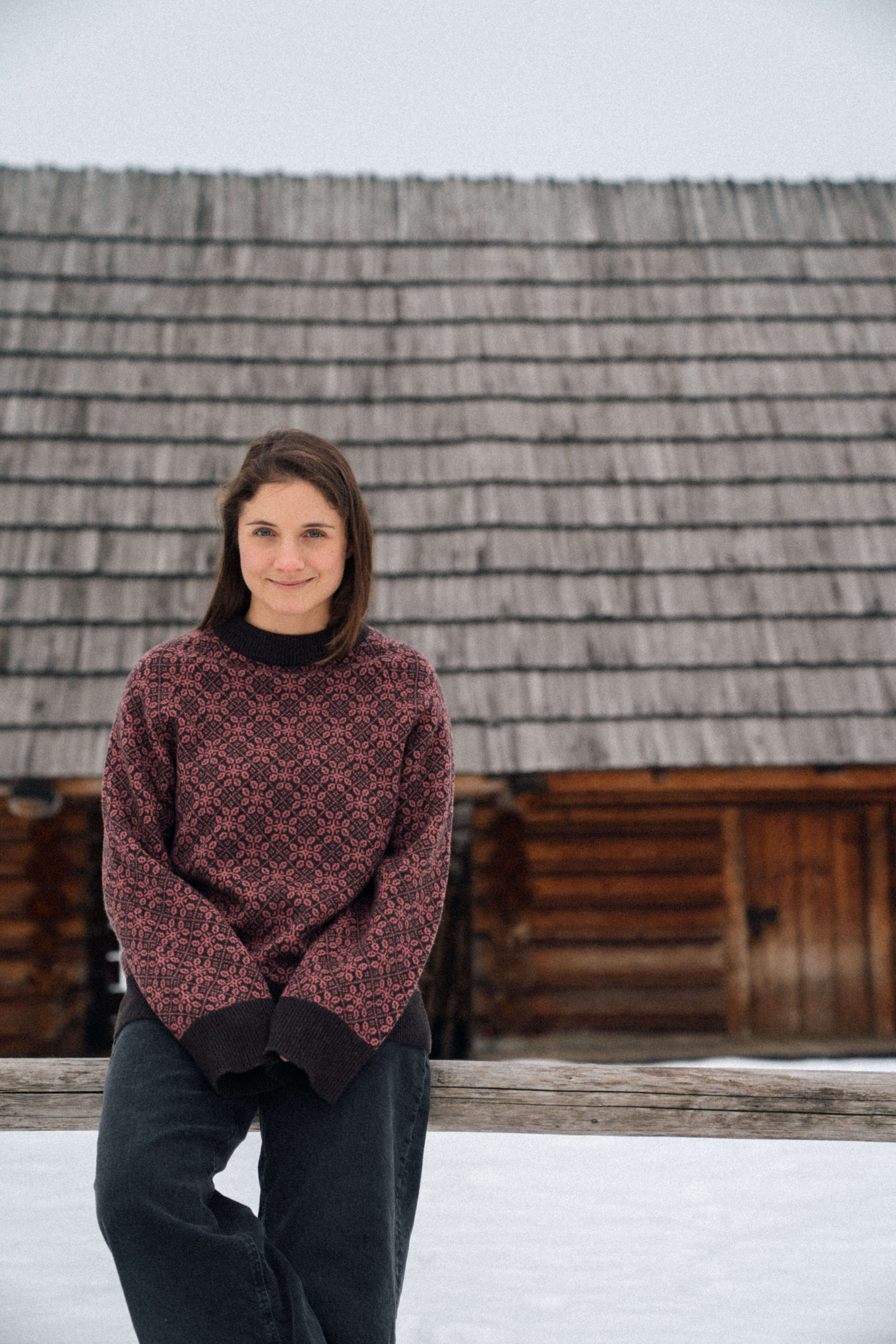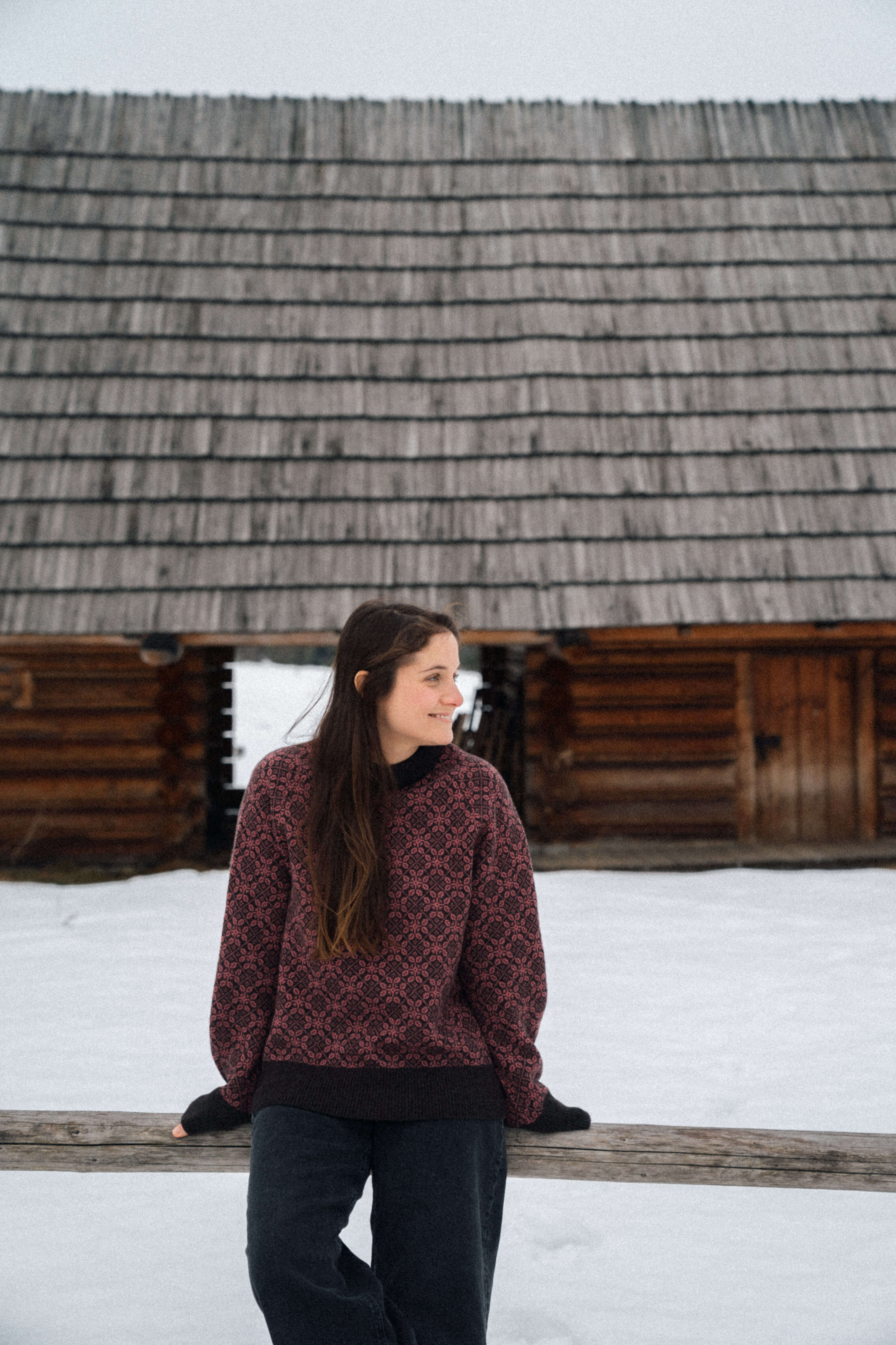 It was meant to be a Norwegian sweater. But instead of fjords, here in the Beskids we have our own peaks, valleys… and patterns. We took inspiration from Nordic motifs and dressed them in Beskid embroidery – a touch of Lemko, a hint of Highlander… Instead of a direct copy, we went for a creative reinterpretation – preserving the rhythm, symbolism, and color palette while giving it a minimalist, functional character. The result? A pattern that pays tribute to the heritage of our beloved region while giving it a fresh, modern twist.