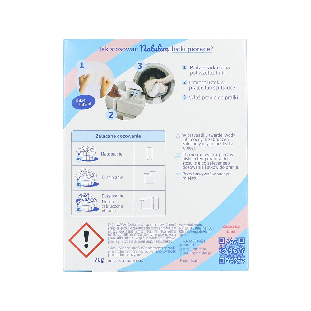 Jeden listek to pełna porcja detergentu, wystarczająca na pranie ok. 8 kg ubrań (w zależności od ich stanu zabrudzenia). W przypadku prania ręcznego podziel listek i użyj połowy lub 1/4, w zależności od ilości wody, którą będziesz używać do prania i ilości pranych produktów.
